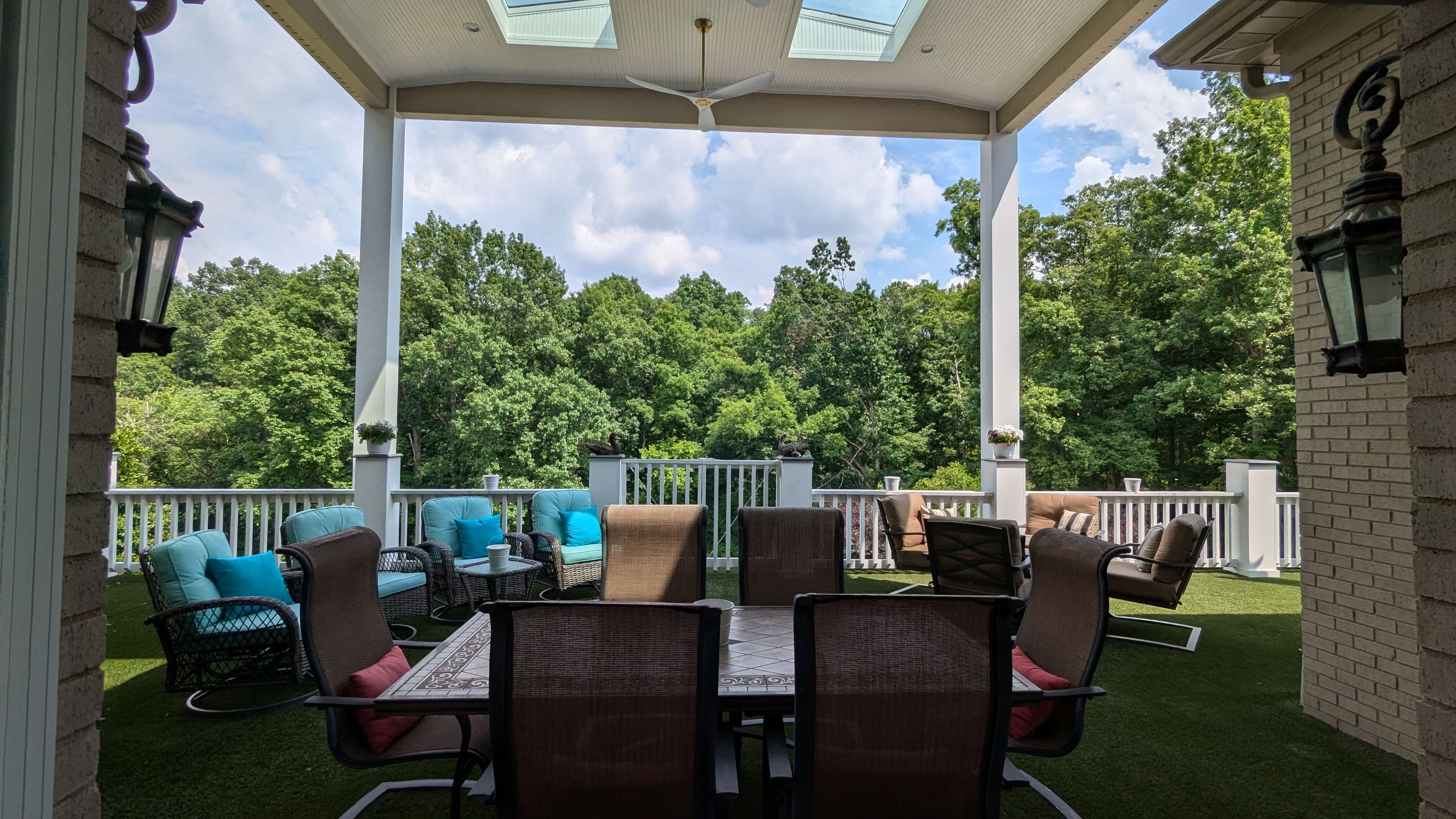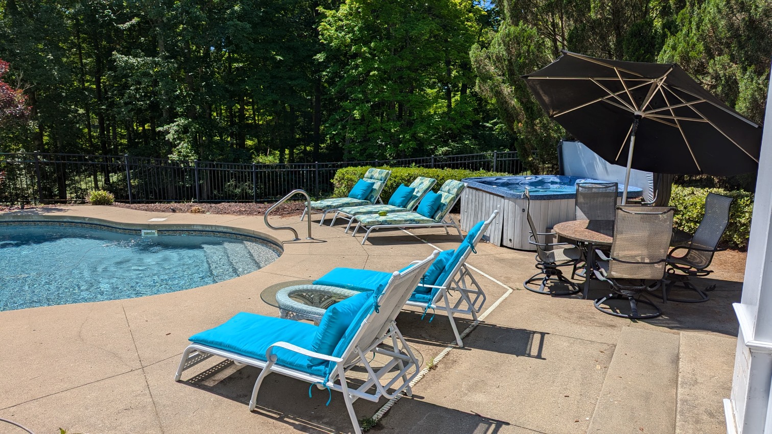 The house is located in a private, gated community of 5 acre lots...sweeping lawns with a lush forest background. Has a huge deck and covered patio, salt-water pool and hot tub, outdoor grill. Faces west, so great shade for evenings entertaining outside...and great sunsets out the front!